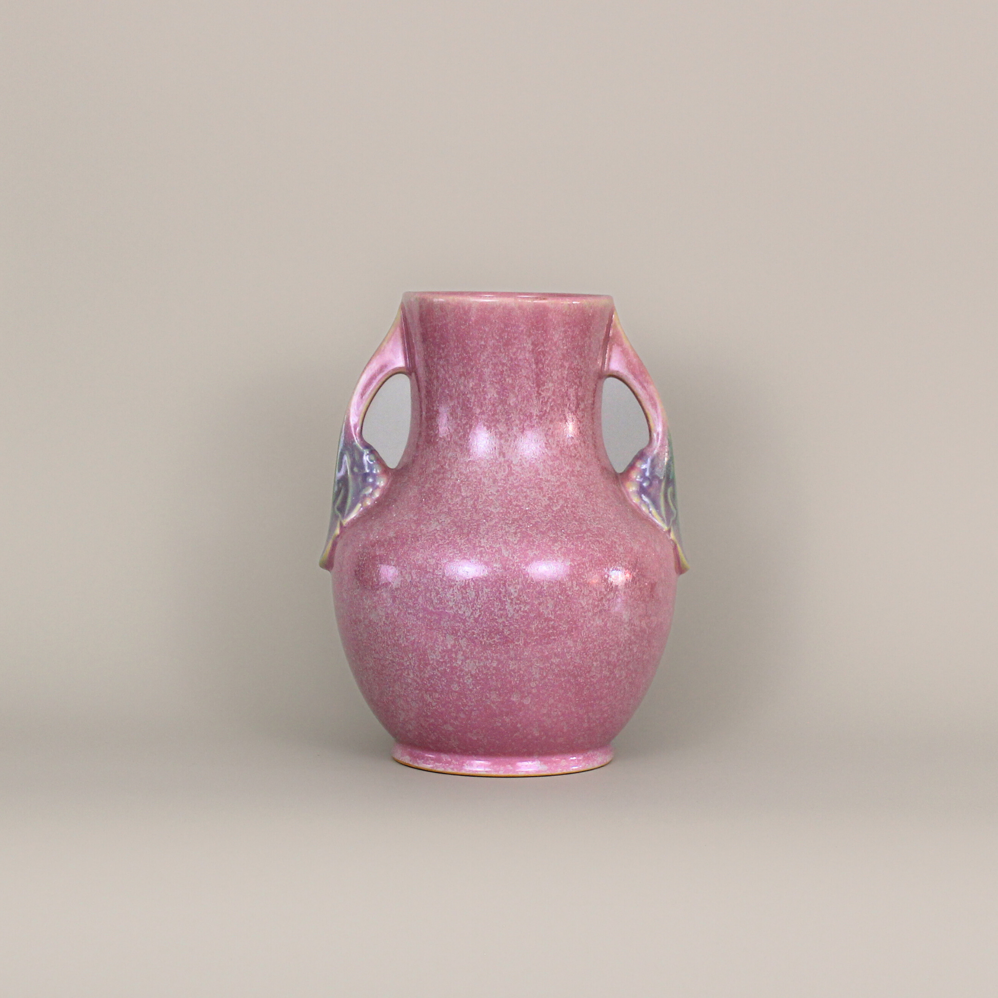 Lovely rounded Roseville Pottery Tuscany vase. The curved handles end in large leaves with clusters of small grapes. The body is glazed in a mottled pink.